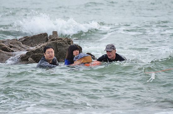 四月末的青島,海水依舊冰冷。腳剛一進水,刺骨得冰冷。兩人向礁石挪動了不到5米,海水已經(jīng)淹沒到腰部。岸上的人焦急地喊道:“看著點??!”浪花一個接一個打過來,也把沿岸的海水打渾了,寇海濤只能用腳探著海底摸索著往前走。臨近礁石不到一米的距離,海水一下淹到了寇海濤的肩膀,冰冷的海水頓時讓人有種喘不過氣的感覺。寇海濤憋住一口氣,奮力往前一沖,猛地爬上礁石。緊跟后面的老外正要爬上礁石,腳下一滑,身體向右側(cè)了過去,緊跟著一個浪頭打過來,老外被打得身子又向左面滑去,差點摔倒在水里。寇海濤見狀一把拉住老外,把他拉上了面積不大的礁石。